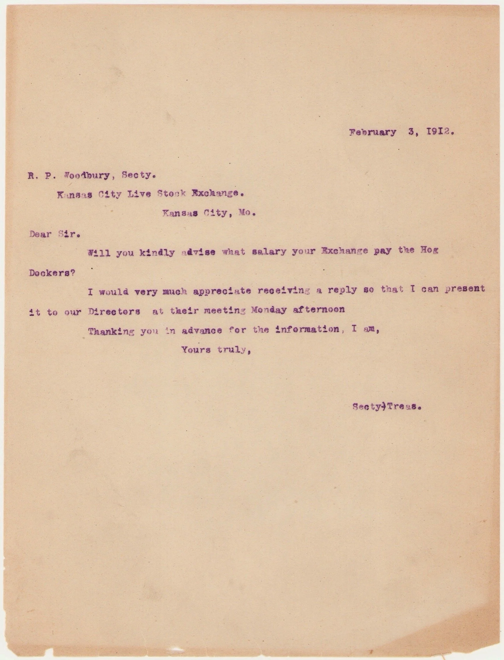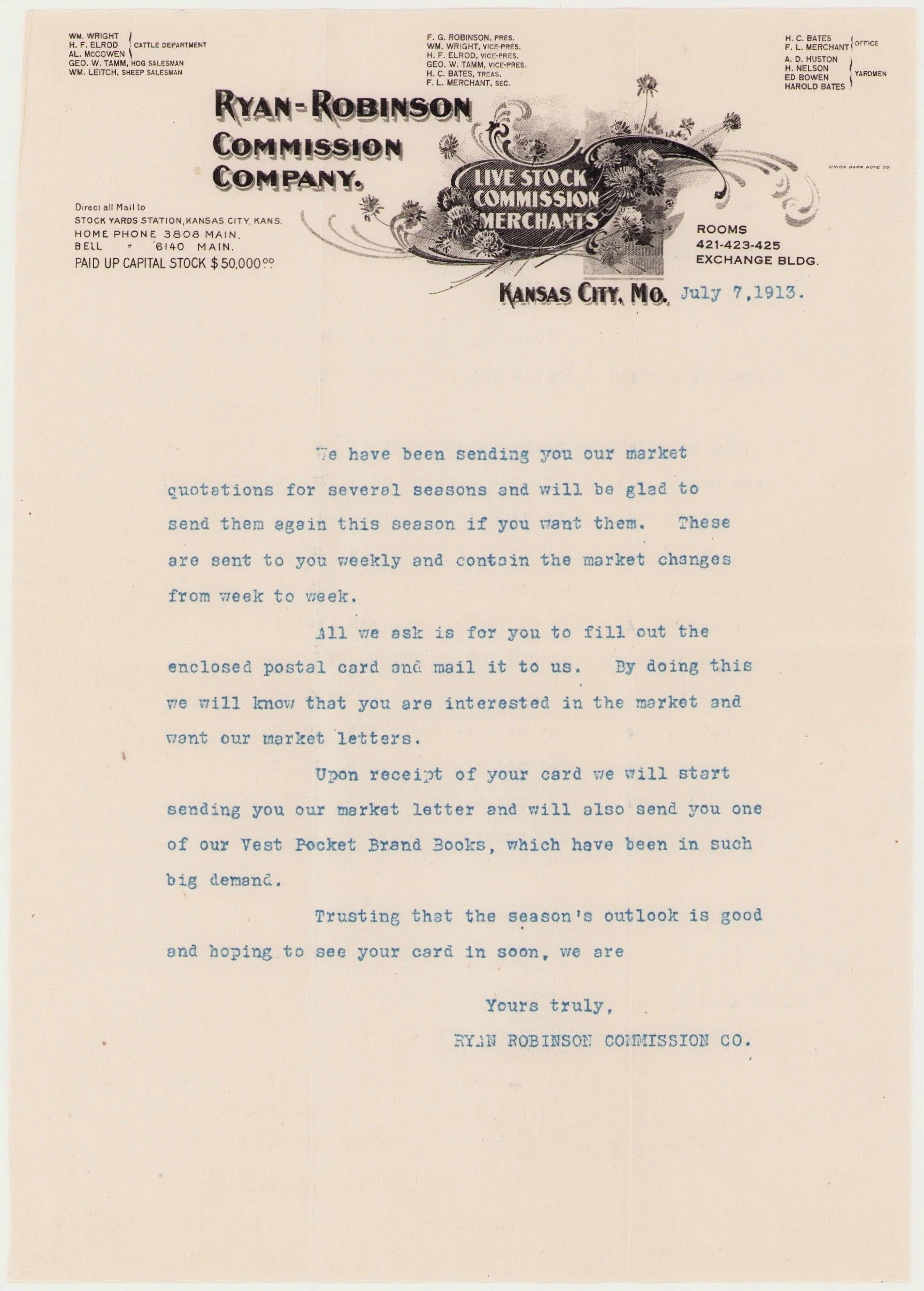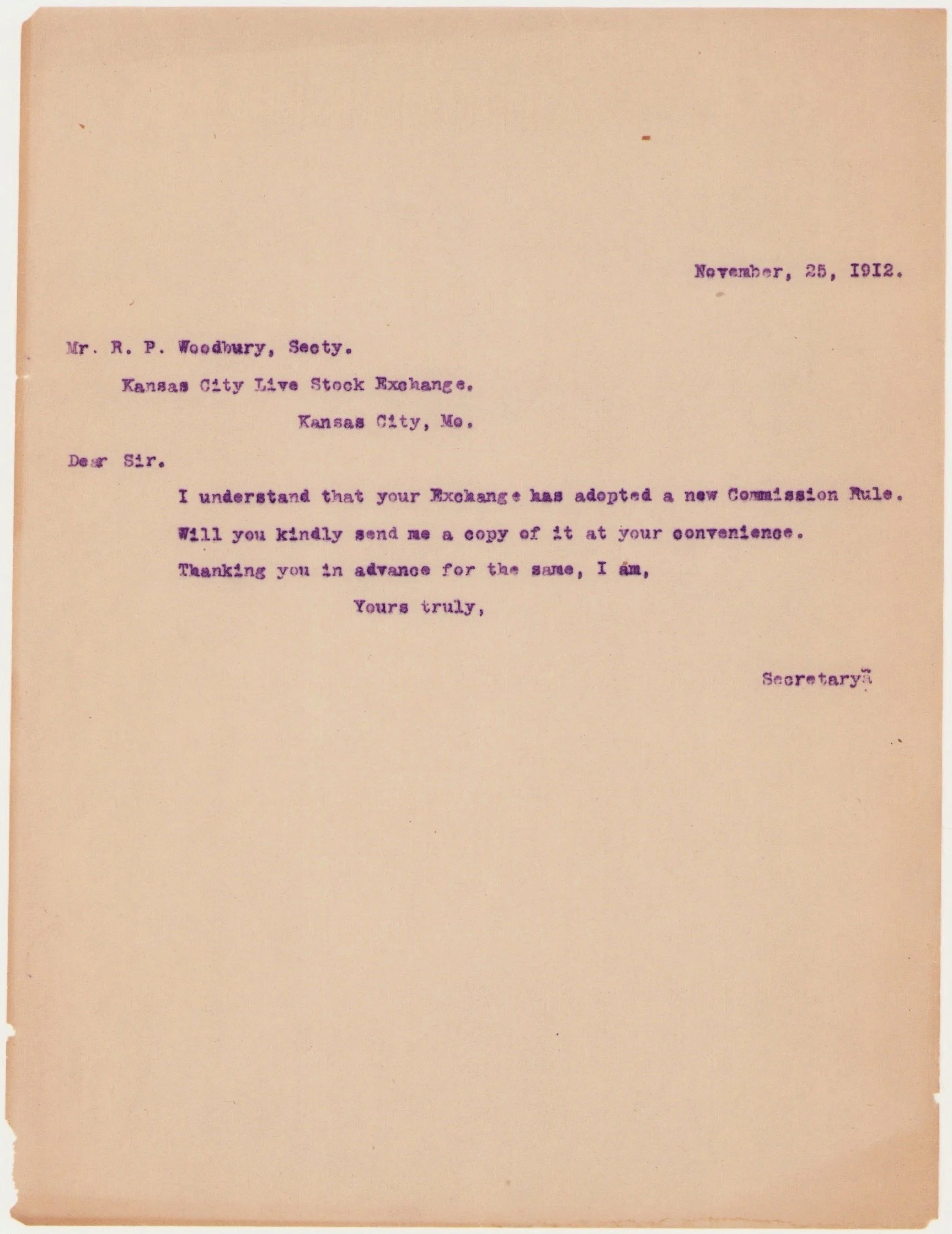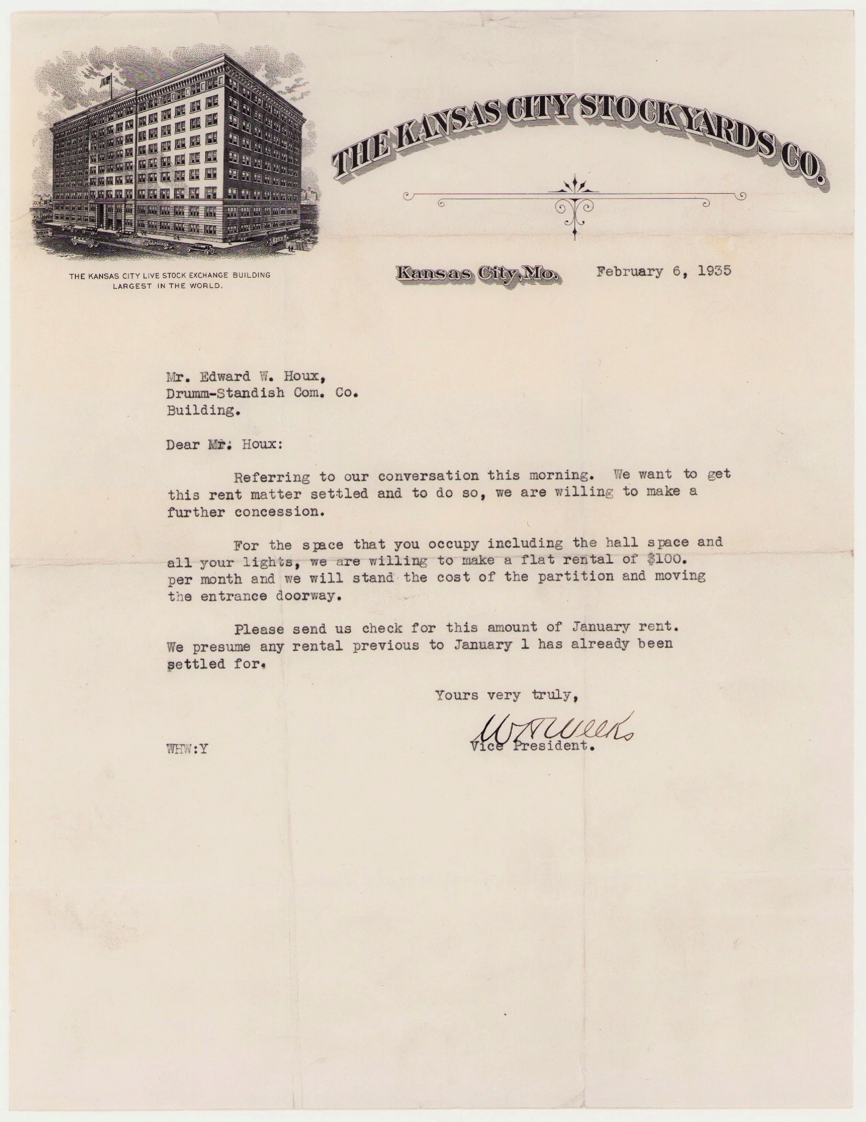Explore letters and documents from the early 1900s and beyond. These letters, sent to and from people who worked in the Livestock Exchange Building and Kansas City Stockyards, offer a rare look into the history of what was once the engine of Kansas City's biggest economic engine.