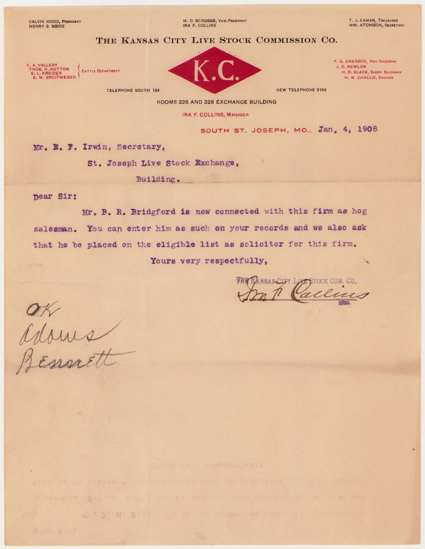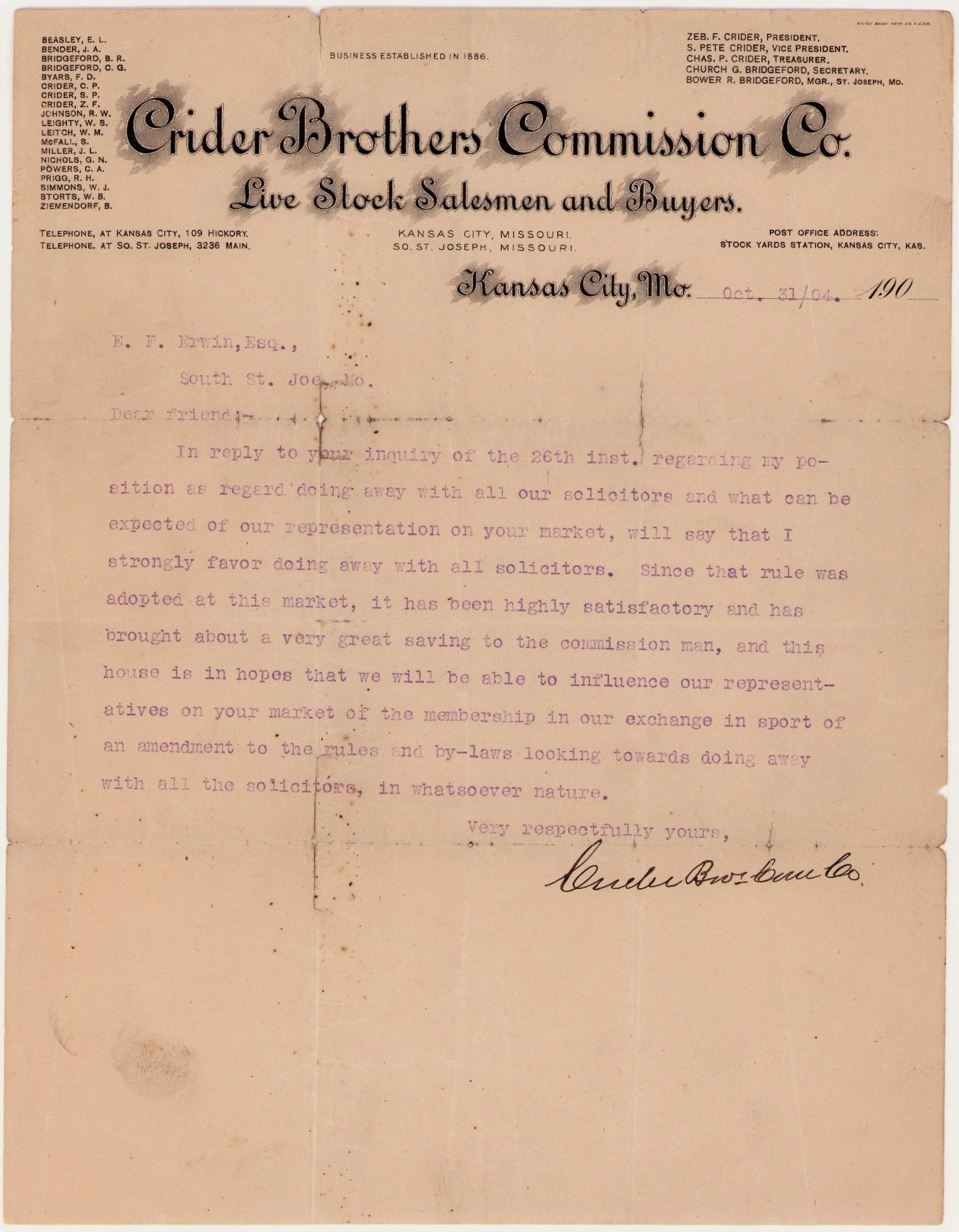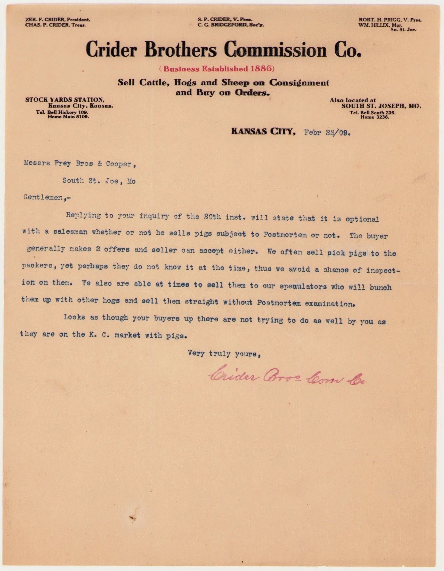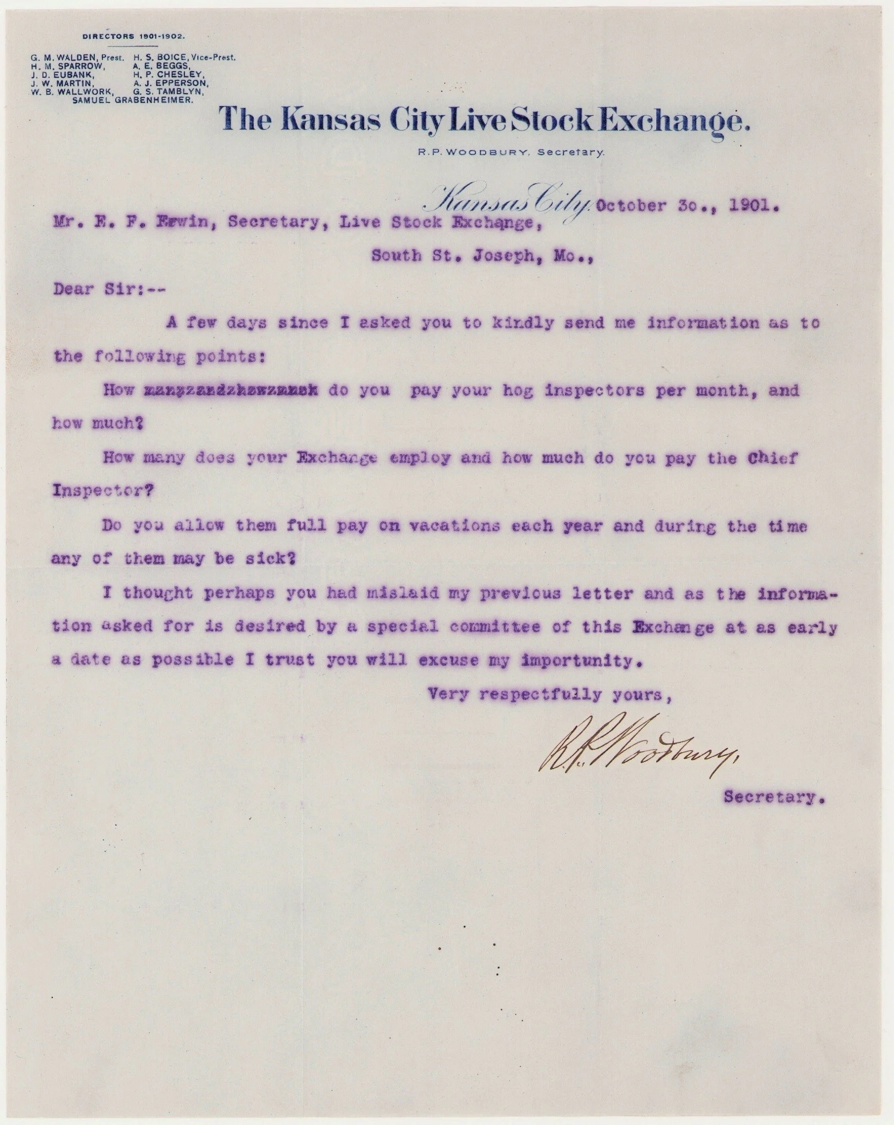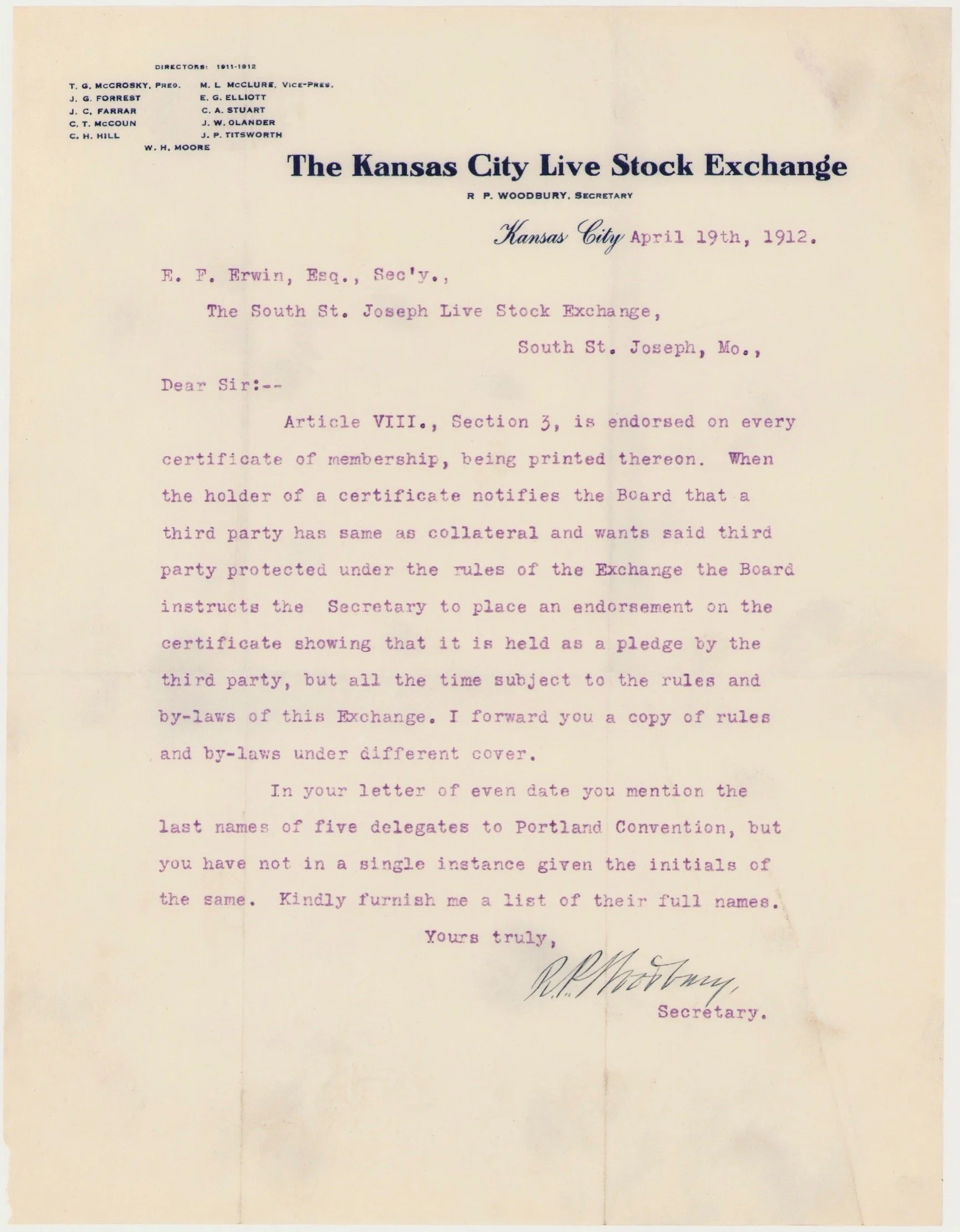 Explore letters and documents from the early 1900s and beyond. These letters, sent to and from people who worked in the Livestock Exchange Building and Kansas City Stockyards, offer a rare look into the history of what was once the engine of Kansas City's biggest economic engine.